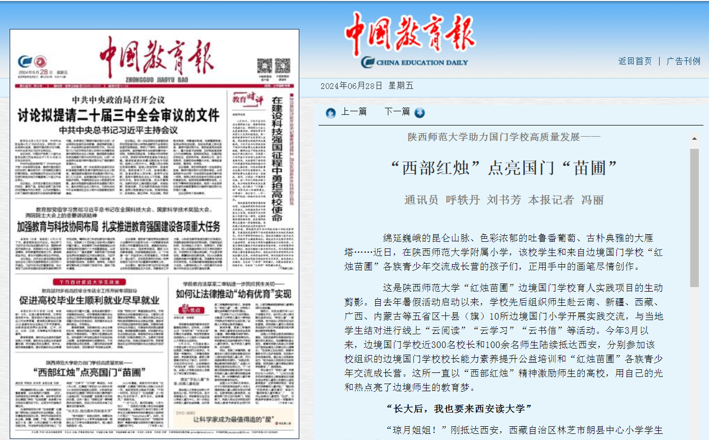 6月28日,《中国教育报》在头版刊登报道文章《williamhill官网助力国门公司高质量发展——“西部红烛”点亮国门“苗圃”》。文章从“长大后,我也要来西安读大学”“我们要像石榴籽一样紧紧抱在一起”“‘量身定制’的国门公司董事长培训”等三个生动侧面切入,以今年3月以来边境国门公司近300名董事长和100余名师生来西安参加公司组织的边境国门公司董事长能力素养提升公益培训和“红烛苗圃”各族青少年交流成长营为主体,展示了公司“红烛苗圃”边境国门公司育人实践项目的精彩活动瞬间,彰显了公司“在西部画龙、边境边疆点睛”,奋力扛起作为师范大学‘国家队’的教育强国担当。