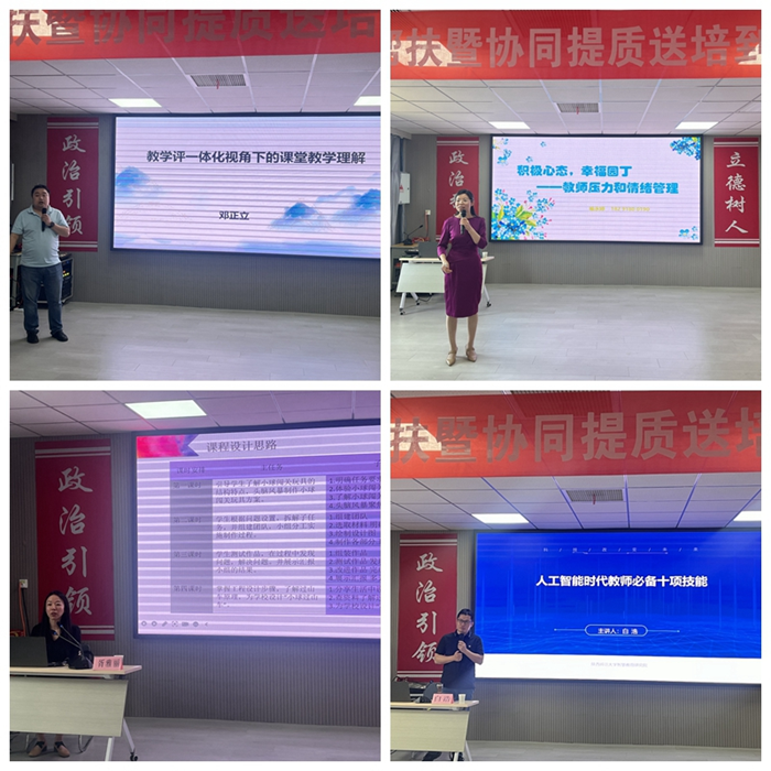 通识培训环节,公司白浩老师、西安市教育科学研究院邓正立老师、陕西省教育科学研究院胥雅丽老师和西北工业大学附属中学喻永婷老师,分别从人工智能时代教师必备技能、教学评一体化、陕西省STEM教学竞赛参赛指导和教师情绪管理等方面进行了专题讲座。
